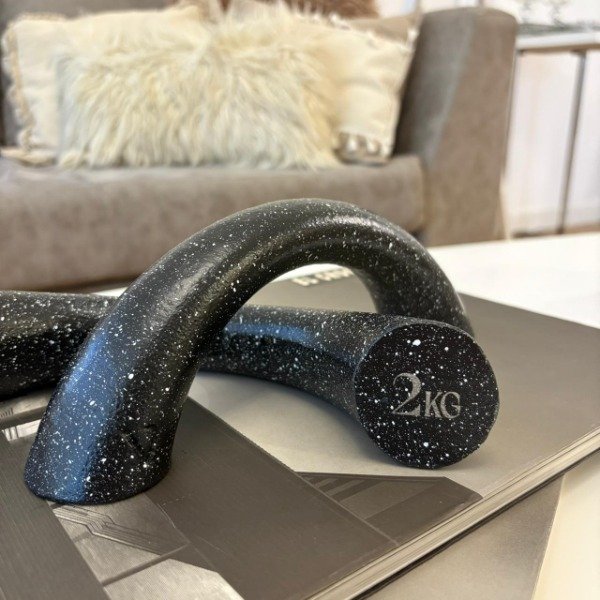 El combo incluye 2 pesas decorativas tipo mancuerna de 2 kilos cada una.